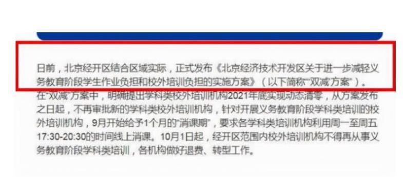 北京經(jīng)開區(qū)發(fā)出了雙減的進一步方案,對于原來周中可以開班的學(xué)科類培訓(xùn)課程,將于2021年底實行動態(tài)清零,9月份是一個緩沖期,從十一假期開始,該地區(qū)的所有校外培訓(xùn)班的學(xué)科類課程面臨關(guān)停,周中上課已然成了過去式,對于已經(jīng)付費的家長,各機構(gòu)也將于2周一到周五實行退費和消課。