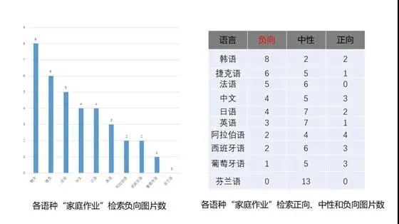 我按照?qǐng)D片的情緒負(fù)向、正向、中性來(lái)做了一個(gè)計(jì)數(shù)(見(jiàn)圖1)。發(fā)現(xiàn)韓國(guó)語(yǔ)檢索到的負(fù)向圖片有8張。芬蘭語(yǔ),沒(méi)有一張負(fù)向的圖片,也沒(méi)有一張正向圖片,只有中性圖片。所以芬蘭這個(gè)國(guó)家是不是特別值得研究?中文檢索的家庭作業(yè)圖片,出乎大家的意料,負(fù)向圖片也不多,正向圖片也有,中性圖片也有。做一個(gè)簡(jiǎn)單的統(tǒng)計(jì),可以看到,如果從社會(huì)輿論的角度來(lái)看,韓國(guó)的家庭作業(yè)問(wèn)題更為突出。并且,東亞地區(qū)普遍負(fù)向評(píng)價(jià)較多。東亞國(guó)家的教育競(jìng)爭(zhēng)、社會(huì)的競(jìng)爭(zhēng)相對(duì)比較強(qiáng),所以造成這一問(wèn)題的原因很可能是社會(huì)競(jìng)爭(zhēng)的傳遞。