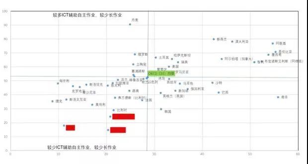 以O(shè)ECD的31個(gè)國(guó)家的均值畫一個(gè)十字線(見(jiàn)圖7),我們可以看到,上海、臺(tái)灣和日本是較少布置用信息技術(shù)輔助進(jìn)行的自主作業(yè)的,也很少布置長(zhǎng)作業(yè)。與很多發(fā)達(dá)國(guó)家相比,這種特征更加明顯。這與整體教育的關(guān)注度有非常大的聯(lián)系。當(dāng)然并不能據(jù)此詬病我們的老師故意不布置這樣的作業(yè)。