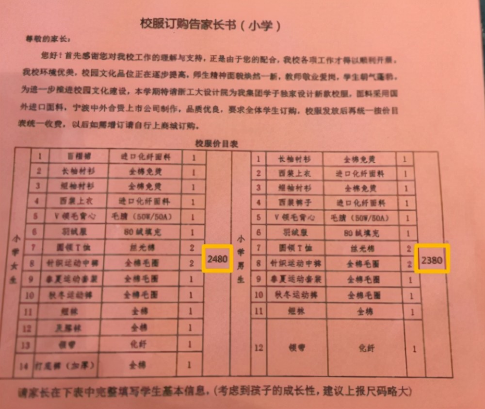 上海某校出現(xiàn)了“天價(jià)校服”賬單,從這份告家長(zhǎng)書(shū)上,能夠看出2021年新生校服的總價(jià)格高達(dá)2320元,雖然包括的夏季和冬季還有運(yùn)動(dòng)裝等等,但如此高昂的價(jià)格也讓很多人感到疑惑,校服上面是繡“金線”了嗎,還是鑲金子了?一件普通的學(xué)生校服憑什么要價(jià)這么貴?