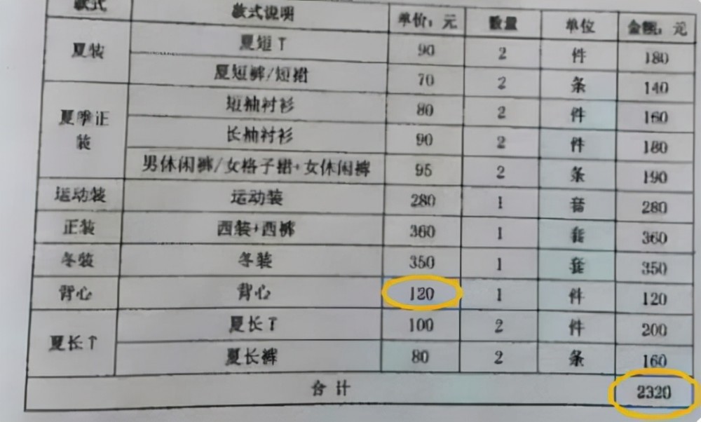 可能是怕小學(xué)生表達(dá)不清楚,學(xué)校特地把校服的明細(xì)打印了出來,從校服繳費(fèi)單中我們可以看到,大大小小的校服一共18件,最便宜的短裙、短褲是70一件,而最貴的是冬裝,需要350一套,總共加起來是2320元的校服費(fèi)用。