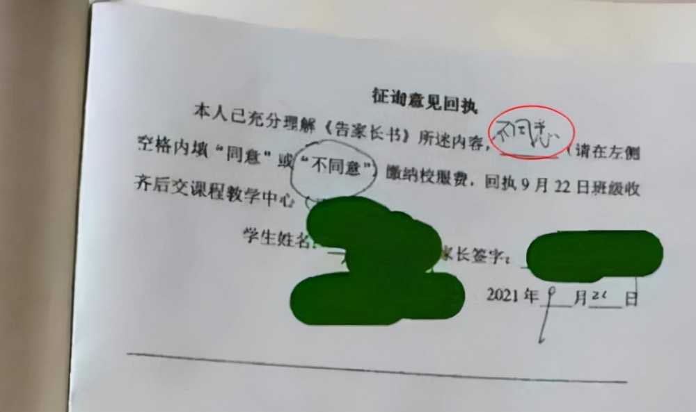 2000多塊,對于上海的普通家庭來說,并不算很多,但是一所普通小學(xué)的校服就要一次性繳納上千元,明顯是超出了很多家長的預(yù)期,于是這位“勇敢”的家長在校服繳費(fèi)的回執(zhí)單上,霸氣的簽字“不同意”,還特地在單子上把這三個(gè)字圈了出來。