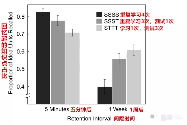 而且,請大家注意一點(diǎn),哪怕只有一次測驗(yàn),學(xué)習(xí)效果也比不測驗(yàn)好很多。