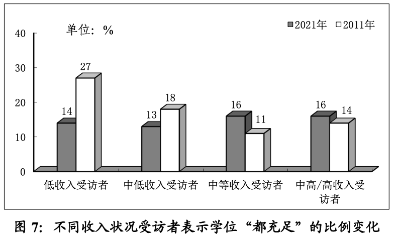 值得關(guān)注的是,較2011年,低收入和中低收入受訪者表示學(xué)位“都充足”的比例下降,其中低收入受訪者表示“都充足”的比例明顯下降了13個百分點為14%,中低收入受訪者表示“都充足”的比例下降了5個百分點為13%,與其他收入人群比例持平或上升有著明顯差異。