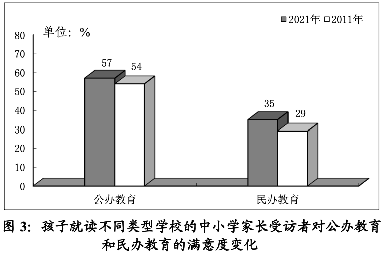 追蹤民調(diào)結(jié)果顯示,受訪者對本地教育服務(wù)總體狀況的評價多年來持續(xù)改善,滿意度從2011年到2021年上升了25個百分點到55%,不滿意度從22%降到9%。作為親歷者的家長受訪者對教育服務(wù)狀況的滿意度亦有明顯改善,10年來上升了20個百分點,為49%。