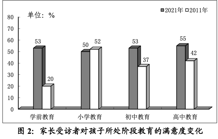 從不同階段的教育服務(wù)來看,孩子在讀幼兒園、小學(xué)、初中、高中的家長對孩子所處階段教育的滿意度在50%及以上。較2011年,這些人群對學(xué)前教育、初中教育和高中教育的評價改善,滿意度分別上升了33個百分點、16個百分點和13個百分點。但小學(xué)教育的滿意度多年維持在50%左右的水平,值得注意。