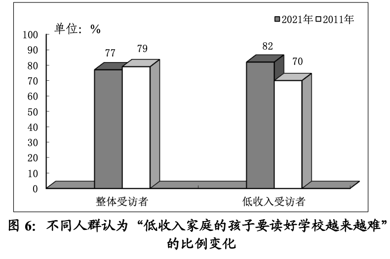 此外,77%的大多數(shù)受訪者表示低收入家庭的孩子要讀好學(xué)校越來越難了,數(shù)據(jù)與2011年相比沒有變化。進一步分析還發(fā)現(xiàn),低收入受訪者持此看法的比例上升,較2011年上升了12個百分點達到82%。