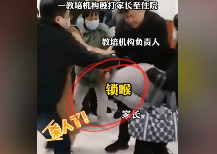 在一處教育機(jī)構(gòu)內(nèi),窗明幾凈,這明明是一處學(xué)習(xí)的場(chǎng)所,如今卻面目全非。教室內(nèi),幾名家長(zhǎng)被一群機(jī)構(gòu)工作人員團(tuán)團(tuán)圍住,拳腳相加,一名年紀(jì)已經(jīng)不小的男性家長(zhǎng)雖奮力反抗,但無(wú)奈對(duì)方人多,他被教育機(jī)構(gòu)的人死死卡住脖子,猛扇耳光,一名孕婦家長(zhǎng)更是被教育機(jī)構(gòu)的人團(tuán)團(tuán)圍住踢打,場(chǎng)面十分混亂。