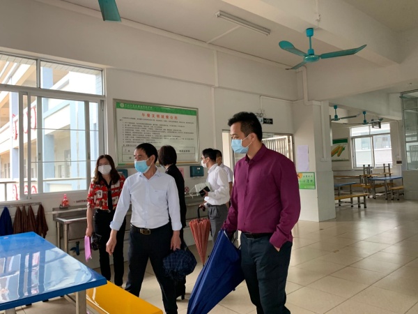 黃局長首先帶領(lǐng)東鳳復(fù)學(xué)專班一行人,實地查看了學(xué)校的校門檢測區(qū)、觀察區(qū)、課室、飯?zhí)?、健康觀察室、校醫(yī)室、洗手間等場所。同時,認(rèn)真地聆聽了香港新徽國際教育集團總裁助理方凡從組織管理、校園環(huán)境設(shè)施管理、物資保障等方面的學(xué)校疫情防控工作和學(xué)生返校準(zhǔn)備情況的匯報。接著,又通過仔細(xì)查閱資料,全面、細(xì)致地檢查了學(xué)校返校復(fù)學(xué)各項準(zhǔn)備工作,并現(xiàn)場研究解決當(dāng)前存在的困難及問題。