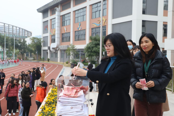 1月7日,全體師生在國旗下隆重舉行了2021年“慈善萬人行”慈善捐款和愛心衣物捐贈活動。學校全體教師有序排隊捐出善款,為同學們做出表率。各班學生代表鄭重地把本班所籌集的善款投入箱中,一雙雙溫暖的小手,將愛匯聚。