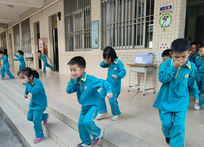 8點整,隨著警報聲響起,各班班主任和科任教師及時準(zhǔn)確地組織學(xué)生,迅速進(jìn)入緊急疏散狀態(tài)。在老師的帶領(lǐng)下,全體學(xué)生彎著腰、貓著步,用手帕、毛巾等捂住口鼻,快速而有序地按預(yù)定疏散路線,從“災(zāi)害現(xiàn)場”逃離,疏散到學(xué)校的操場上。1400多名師生訓(xùn)練有素地從各個室場撤離到學(xué)校小操場空地,隨后各班班主任清點人數(shù),匯報給學(xué)校安全主任。能如此快速有序地撤離,得益于浪網(wǎng)小學(xué)平時對安全工作的重視,師生們在疏散時牢記注意事項與撤離路線。