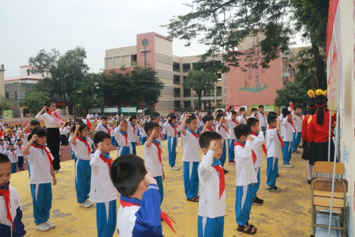 入隊(duì)儀式在莊嚴(yán)肅穆的出旗曲中拉開了帷幕,大隊(duì)旗伴隨著雄壯高昂的旋律飄揚(yáng)。精神抖擻的隊(duì)員們齊唱隊(duì)歌,嘹亮的歌聲響徹運(yùn)動(dòng)場(chǎng)。緊接著,大隊(duì)輔導(dǎo)員廖樂(lè)詩(shī)老師宣讀組建二年級(jí)中隊(duì)的決定,并宣布新隊(duì)員名單。新隊(duì)員們滿心期待,靜候六年級(jí)隊(duì)員為之授紅領(lǐng)巾。當(dāng)佩戴上鮮艷的紅領(lǐng)巾時(shí),每位新隊(duì)員都意氣風(fēng)發(fā),喜笑顏開。