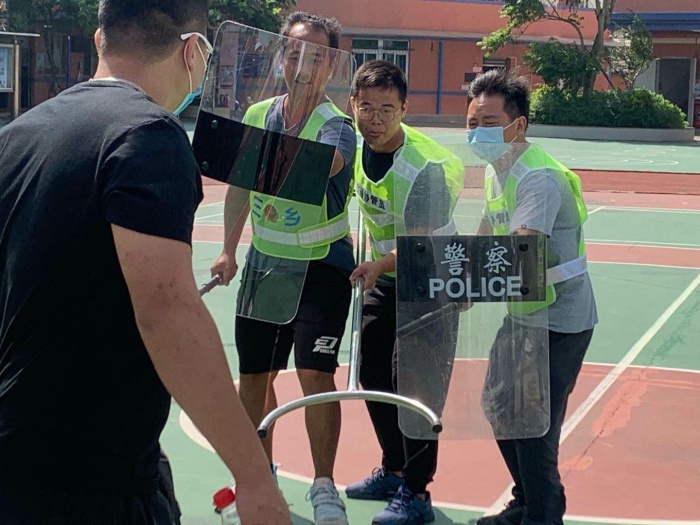 接著,鄭觀明警官和黃偉龍警官宣布大家進入“突發(fā)事件應急處置”演練環(huán)節(jié)。情境設定:由一名便衣民警同志模擬充當危險分子的角色,手持兇器對護校隊員進行攻擊,試圖沖擊校園安保防線。護校隊當即進入突發(fā)情況應急狀態(tài),保安和護校隊員們快速組成合作小組,一邊利用手中的鋼叉、盾牌和警棍等器械與危險分子周旋,同時啟動一鍵報警系統(tǒng),護校隊員們各就各位,迅速聯(lián)系肖家村派出所和西山村委治保會力量,協(xié)力將危險分子制服。