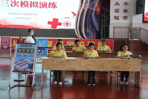 演練從餐前學(xué)生(學(xué)生由生活部老師扮演)排隊(duì)洗手、進(jìn)入餐廳開始。學(xué)生在進(jìn)入飯?zhí)们坝行蚺抨?duì)用“七步洗手法”洗手,然后進(jìn)入餐廳隔位而坐,摘下口罩開始進(jìn)餐。進(jìn)餐過程中有學(xué)生咳嗽難受,生活老師發(fā)現(xiàn)后為該生體溫檢測(cè)為37.6℃,立即提醒周邊同學(xué)們佩戴口罩,并通知樓長帶領(lǐng)周邊同學(xué)到備用區(qū)重新配餐、就餐。生活老師報(bào)告醫(yī)務(wù)室以及生活部主管,帶領(lǐng)該生前往留觀室做詳細(xì)檢查。醫(yī)生為該生做更進(jìn)一步檢查和相關(guān)詢問后,將異常情況匯報(bào)給沈偉忠校長以及該生的生活老師、班主任。沈偉忠校長收到反饋信息后,向上級(jí)教育部門匯報(bào)。校醫(yī)室立即向鎮(zhèn)疾控中心報(bào)告,班主任立即向家長通報(bào)情況,校醫(yī)通知總務(wù)處安排人員對(duì)餐廳進(jìn)行消毒。最后,疾控部門到場(chǎng)處理,接學(xué)生到醫(yī)院就診。沈校長馬上召集相關(guān)部門的管理人員會(huì)議,啟動(dòng)緊急應(yīng)急處置預(yù)案。
