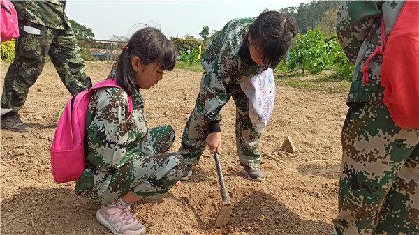 3月25日上午8時,白石環(huán)小學(xué)一至三年級學(xué)生由12位教官帶領(lǐng),身著迷彩服,神采飛揚(yáng)地乘車來到坦洲雛鷹研學(xué)訓(xùn)練營地。集合后,基地教官進(jìn)行了紀(jì)律的規(guī)范與各項(xiàng)注意事項(xiàng)的提醒,授予營旗,學(xué)校德育處謝萬明主任作了開營講話,并宣布活動開始。各班有序進(jìn)入各活動區(qū)域,開始磨豆?jié){、射擊、挖寶、種豆、拔草、澆水、打槍等九個項(xiàng)目的實(shí)踐。每個學(xué)生都很快融入其中,認(rèn)真地推磨、接漿,連根拔草、細(xì)心澆灌;精心種植;專注瞄準(zhǔn)……認(rèn)真完成教官交給的每一項(xiàng)任務(wù),大家相互關(guān)照,團(tuán)結(jié)協(xié)作,興趣盎然。下午4時30分,學(xué)生順利返回學(xué)校。
