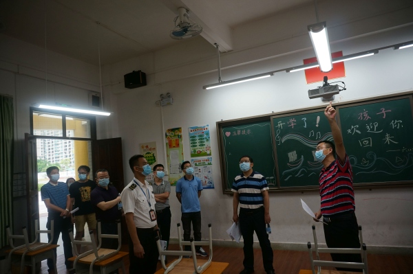 初夏,三角梅盛綻,返校復(fù)學(xué)在即。 5月9日上午,由沙溪鎮(zhèn)教育事務(wù)指導(dǎo)中心主任汪峰帶隊(duì),鎮(zhèn)疾控中心阮鏗結(jié)、市場監(jiān)管分局劉水添、教育事務(wù)指導(dǎo)中心張乖祥、楊海榮、林子田組成的復(fù)學(xué)返校驗(yàn)收組到沙溪鎮(zhèn)虎遜小學(xué)督導(dǎo)檢查復(fù)學(xué)前各項(xiàng)準(zhǔn)備工作,學(xué)校兼職衛(wèi)健副校長李上有站長、黃金奇校長和各部門負(fù)責(zé)人陪同檢查。驗(yàn)收組對學(xué)校的晨檢設(shè)施、組織領(lǐng)導(dǎo)、制度建設(shè)、網(wǎng)格管理、應(yīng)急措施、心理健康教育、教室布置、物資保障和環(huán)境衛(wèi)生等作了細(xì)致的檢查,以確保學(xué)校在具備疫情防控條件,師生和校園公共安全有保障的前提下開展復(fù)學(xué)。