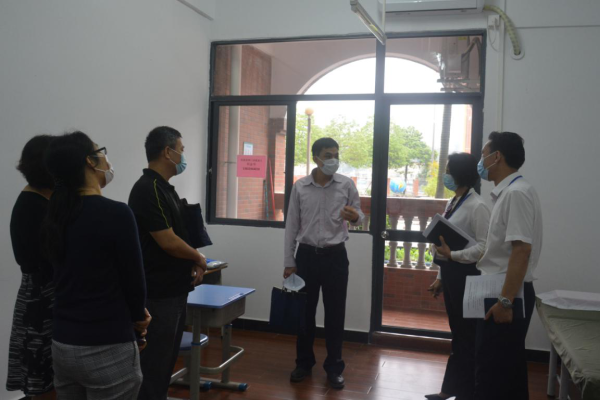 4月22日上午,由中山市教育和體育局、衛(wèi)健局、市場(chǎng)監(jiān)管局組成的學(xué)生返校疫情防控驗(yàn)收組蒞臨神灣育才學(xué)校開展驗(yàn)收工作。