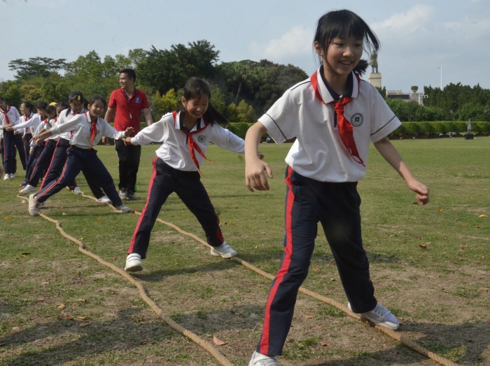 在孫文紀(jì)念公園里,隊(duì)員們進(jìn)行拓展活動(dòng),模擬紅軍長(zhǎng)征途中經(jīng)歷的“四渡赤水”“飛奪瀘定橋”“翻雪山”“過(guò)草地”等場(chǎng)景?!凹t軍不怕遠(yuǎn)征難,萬(wàn)水千山只等閑。”隊(duì)員們翻過(guò)一座座“雪山”,走過(guò)一段段“草地”,渡過(guò)一條條艱險(xiǎn)的“河流”,體驗(yàn)紅軍在長(zhǎng)征中翻山越嶺、克服重重困難的艱辛歷程。有的隊(duì)員們圍坐在一起,講述紅軍二萬(wàn)五千里長(zhǎng)征路上的動(dòng)人故事和艱苦奮斗的革命精神;有的隊(duì)員們高唱《紅星閃閃》《沒(méi)有共產(chǎn)黨就沒(méi)有新中國(guó)》等歌曲,唱響愛(ài)黨愛(ài)國(guó)的最強(qiáng)音。