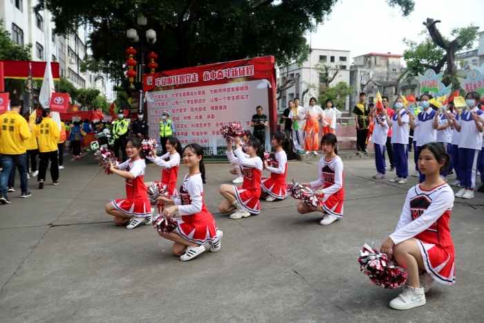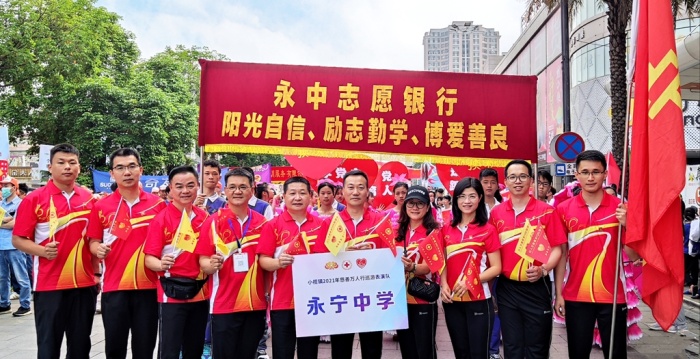 永寧中學(xué)黨支部為積極響應(yīng)慈善活動的倡議,展現(xiàn)永中師生“陽光自信、勵志勤學(xué)、博愛善良”的精氣神,在做好疫情防控的前提下,分別組織了永寧中學(xué)“紅心向黨”盛世花傘巡游隊(duì)、“紅心向黨”啦啦隊(duì)和“同心向黨,志愿同行”公益嘉年華永中志愿銀行攤位展示隊(duì),參加本次萬人行活動。