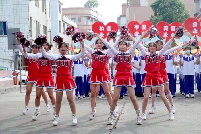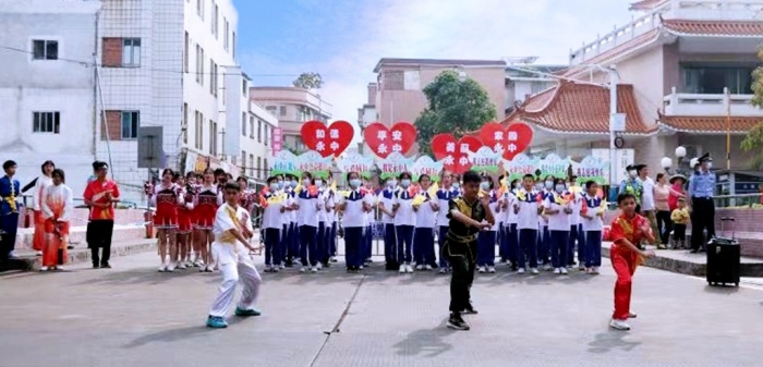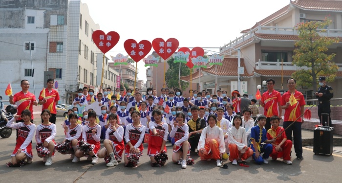 在慈善萬人行巡游深涌橋面上的助興點(diǎn),有一塊“牢記囑托跟黨走,永中奮斗新征程”的宣傳版,展示著永寧中學(xué)的辦學(xué)宗旨、辦學(xué)理念、育人目標(biāo)、辦學(xué)特色等內(nèi)容,這就是永寧中學(xué)“紅心向黨”啦啦隊(duì)為慈善萬人行巡游活動吶喊助興的舞臺。這支隊(duì)伍是一支充滿青春活力、團(tuán)結(jié)協(xié)助,具有陽光自信、勵志勤學(xué)、博愛善良品質(zhì)的特色啦啦隊(duì),共有師生72人,主要表演武術(shù)、啦啦操和花開盛世舞蹈,為巡游隊(duì)伍吶喊助興,他們舉著“和諧永中、平安永中、美麗永中、家園永中”心型主題標(biāo)語和宣傳永中公益銀行及宣傳公益活動的小KT版標(biāo)語,展示永寧中學(xué)教育教學(xué)特色。當(dāng)天清晨的小欖,略帶寒涼,但大伙的心卻是亮堂的、炙熱的、溫暖的。