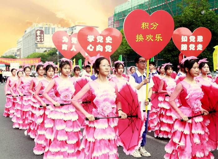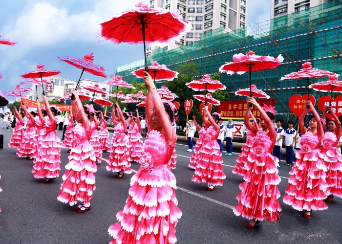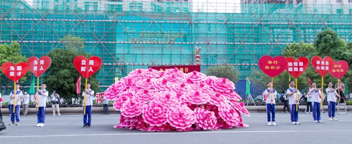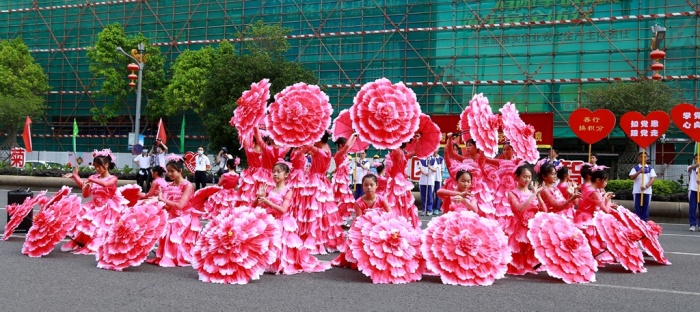 永寧中學(xué)“紅心向黨”花開盛世花傘巡游隊(duì)是一支特別引起觀眾關(guān)注的創(chuàng)新巡行方隊(duì)。他們舞動手中的花傘,舉著“善行換積分、積分換快樂、學(xué)黨史、心向黨、知黨恩、跟黨走、為黨育人、為國育才、立德樹人”等彩旗和標(biāo)語,高喊著“陽光自信、勵志勤學(xué)、博愛善良”的口號,引來了沿途觀眾的陣陣掌聲和喝彩。最引人注目的是答謝臺前,同學(xué)們化著彩妝、手持花傘、翩翩起舞、舞蹈造型盛世花開。同學(xué)們儀態(tài)大方、著裝典雅、亮麗清新,舞蹈既展示了優(yōu)美的中華古典文化,又體現(xiàn)了永中人大愛涌動的情懷,既弘揚(yáng)了中華博愛精神又融入了永中公益元素,贏得了現(xiàn)場領(lǐng)導(dǎo)、嘉賓觀眾的陣陣掌聲。他們?nèi)霾チ艘粋€(gè)個(gè)愛心、收獲一次次感動,充分彰顯出永中人的大愛情懷和澎湃激情。