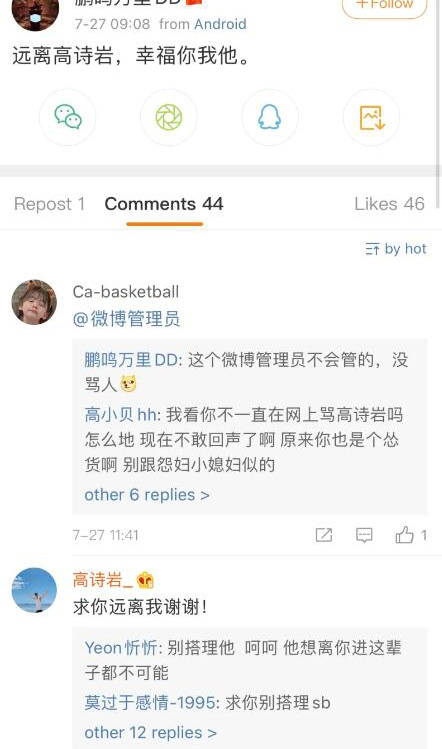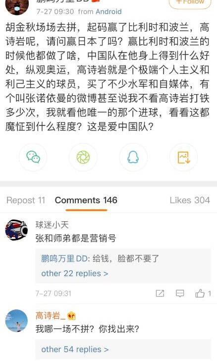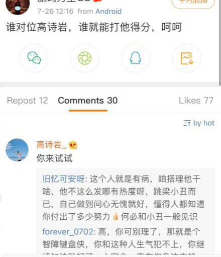 有網友在社交媒體發(fā)表了對高詩巖不滿意的評論,高詩巖則是親自下場在評論區(qū)回懟網友,評論區(qū)也有不少高詩巖的球迷來維護自己的偶像。