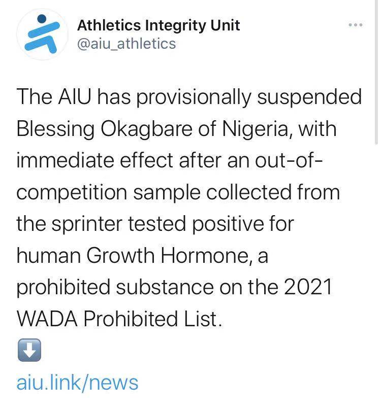 北京時間7月31日,田徑誠信機構(gòu)(AIU)宣布,尼日利亞短跑運動員奧卡巴雷藥檢不合格,將被立即禁賽,這是東京奧運會開幕后首起興奮劑事件。