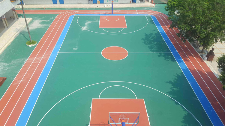 施工工序:打磨場地----清洗---補積水---切割伸縮縫---底涂---伸縮縫埋制---彈性層---找平層---面涂--劃線。