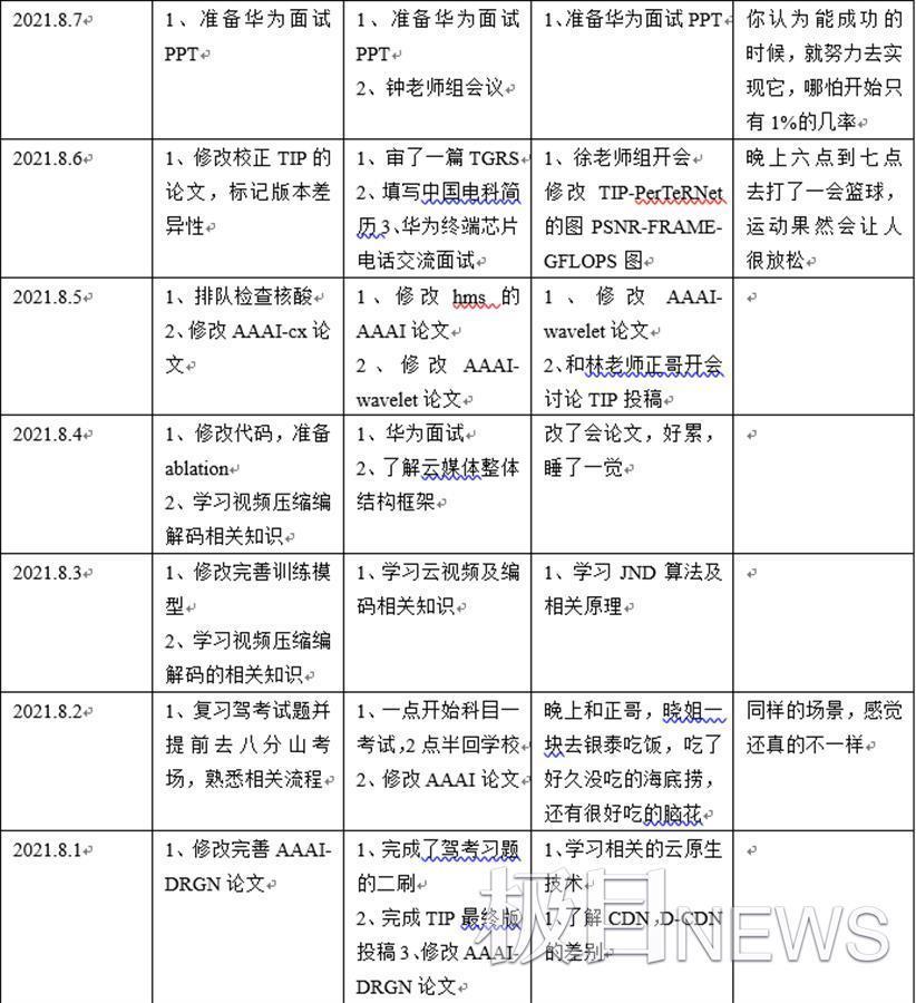 “我在完成一篇論文的時(shí)候,已經(jīng)在寫(xiě)下一篇論文了,同時(shí)還在做下下篇論文設(shè)想驗(yàn)證。這樣時(shí)間是連續(xù)的,形成一個(gè)閉環(huán),中間不會(huì)有空窗期。而且還可以及時(shí)發(fā)現(xiàn)存在的問(wèn)題,互補(bǔ)優(yōu)化?!苯f(shuō),他每天都會(huì)把所有需要完成的事情按照重要程度排序,細(xì)分到每一天的早、中、晚,合理分配在自己的時(shí)間記錄表里。每天晚上,他會(huì)對(duì)照時(shí)間表進(jìn)行總結(jié),查找遺留問(wèn)題,并記錄一些自己的想法。