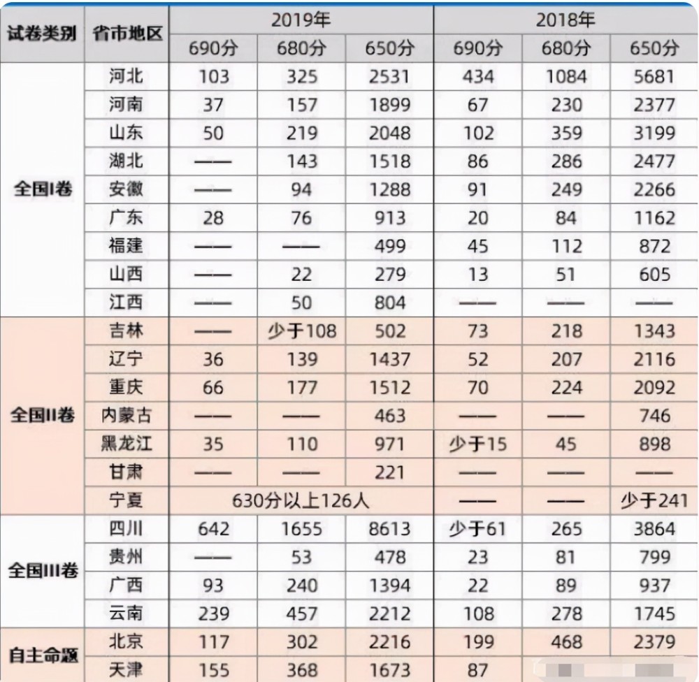 河北:大家都知道河北是我國高考大省,從高考人數(shù)中就可以看出,其人數(shù)和山東人口大省不相上下,成績也十分亮眼,尤其是其高分值的人數(shù),更是超過了100人,中高分成績的人數(shù)的更是高達5000多人。
