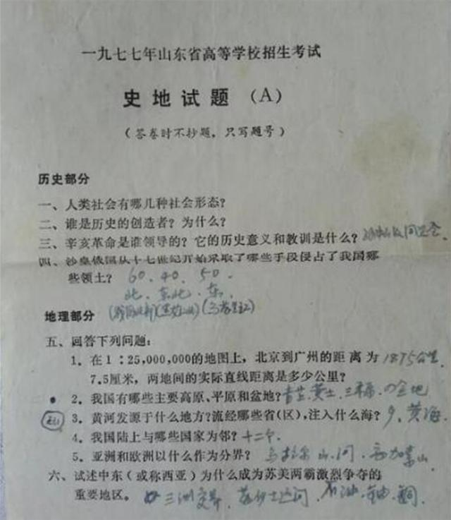 最后我們再來看一下歷史和地理試卷,1977年山東省高考將這兩科放在一起考,兩科一共才占了一面紙,再一看題目,都是最基礎(chǔ)的知識點(diǎn),如果現(xiàn)在高考這么考,估計(jì)滿分的考生占比能超過一半。