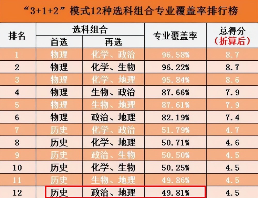 在12種選科組合有一種,是比較不被老師推薦的,那就是史政地的組合,史政地組合從專業(yè)覆蓋率來說就只有50%不到,也就是說選擇這組學(xué)科的學(xué)生,可能有一大半專業(yè)不能選擇,尤其是首選歷史就相當于與放棄了理工類專業(yè)。