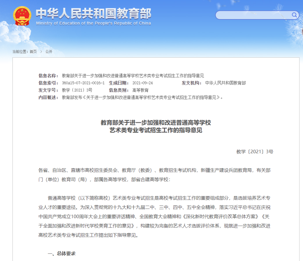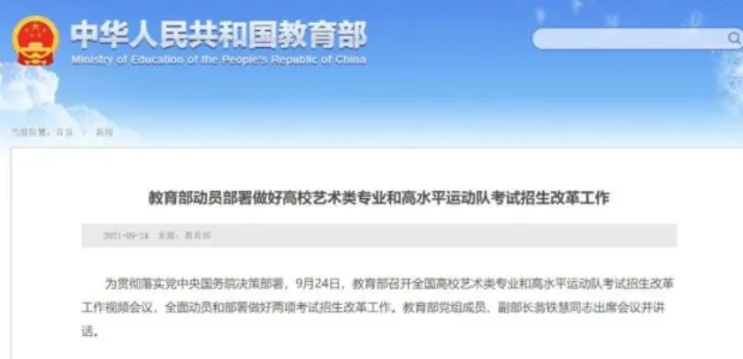 9月24日教育部召開藝術類專業(yè)和高水平運動隊招生改革工作會議,會議中針對藝術類和體育類高校專業(yè)招考進行了重新規(guī)劃。