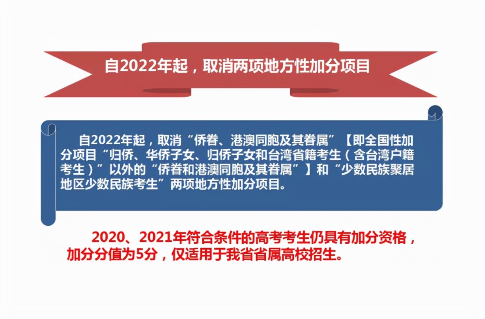 根據(jù)教育部傳來的關(guān)于高考改革的新消息當(dāng)中,可以看到,從2022年開始,地方性加分項(xiàng)目被取消,其中就包括歸僑子女、歸僑、華僑子女、臺(tái)灣籍考生;