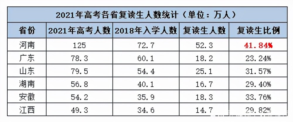 2021年高考復(fù)讀生人數(shù)占比最高的,仍然是河南省,有52.3萬(wàn)參加高考復(fù)讀,復(fù)讀率是41.84%。安徽省、山東省高考復(fù)讀生占比均超過(guò)了30%。湖南省、江西省高考復(fù)讀生比例近30%。