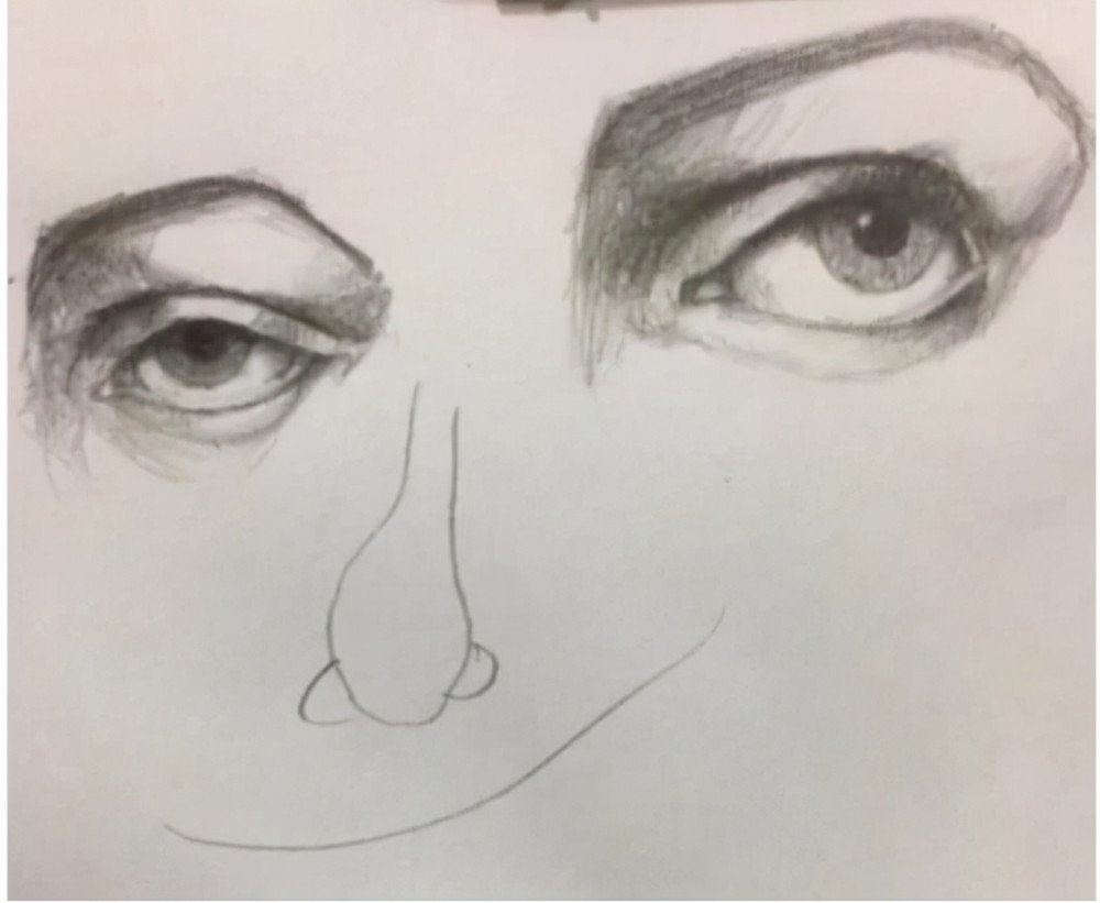 于是,作品中,眼睛部分雖然不算精致,卻也看得過(guò)去。而鼻子與嘴巴線條可謂極其潦草,讓人看都不忍看。閱卷老師看到這幅作品時(shí),唯一的點(diǎn)評(píng)就是:不忍直視!