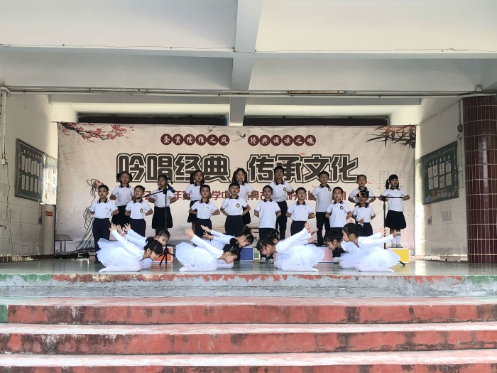 活動伊始,由武術(shù)興趣班的同學帶來了氣勢磅礴的武術(shù)表演,為本次活動拉開序幕。本次比賽以班級為單位,參賽節(jié)目內(nèi)容均圍繞“中華古典詩詞”,表演形式更是豐富多樣,吟誦與舞蹈的結(jié)合,充分展現(xiàn)了吟詠的魅力,將中華傳統(tǒng)文化滲透在每一個節(jié)目中,給全校師生呈現(xiàn)了一個精彩絕倫的舞臺。為豐富比賽過程,在比賽中場增加了詹靈靖和林凝同學參加中山市中華經(jīng)典吟唱比賽的節(jié)目——《金縷衣》,在比賽結(jié)束后增加了我校參加2020年中山市中小學生民樂、戲劇、合唱比賽的節(jié)目——《我們需要“補”什么》。