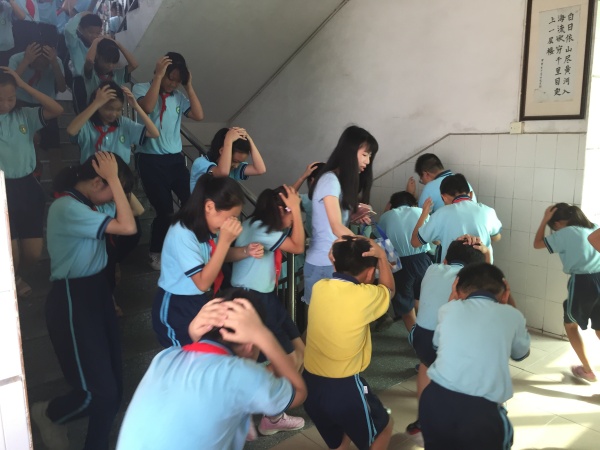 上午8:20,第一次警報(bào)聲音響起,各班學(xué)生在上課教師指揮下,迅速就近蹲在課桌旁、課桌下,抱頭或頭頂書(shū)包躲避。第二次警報(bào)聲音響起后,同學(xué)們?cè)谏险n老師的帶領(lǐng)下,抱著頭緊張而有序地撤離教學(xué)樓。負(fù)責(zé)樓梯口疏導(dǎo)的老師守在通道出口,直到最后一名學(xué)生通過(guò),才迅速撤離。學(xué)生到達(dá)指定安全地帶后,各班班主任和集合地老師迅速就位,維持好各班秩序,清點(diǎn)人數(shù)。