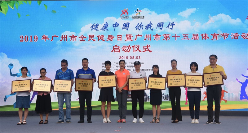 啟動儀式上,廣州市政府副秘書長張建華為來自全市11區(qū)的社會體育指導(dǎo)員志愿者服務(wù)隊(duì)代表進(jìn)行授旗,并宣布活動開幕。廣州市體育局、廣州市體育總會領(lǐng)導(dǎo)分別為獲得“2018年度市屬體育協(xié)會年度考核5星級協(xié)會”和“群體通惠民服務(wù)示范場館”頒發(fā)牌匾。