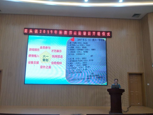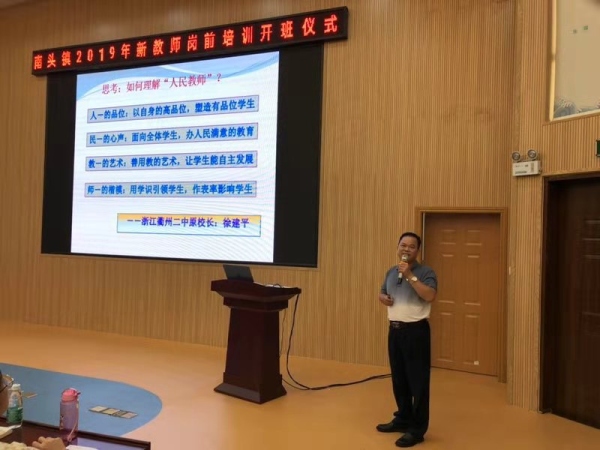 當天上午,文體教育局局長吳永高進行開班動員講話,他要求新教師要樹立遠大的目標,爭做“四有”好教師,要做到“堅持愛崗敬業(yè)不動搖”、“堅持學習不自滿”、“扎實工作不浮躁”、“樹立目標助成長”,更好地為南頭鎮(zhèn)教育事業(yè)發(fā)展做出貢獻。鎮(zhèn)黨委委員薛焯明介紹了南頭鎮(zhèn)近年來經(jīng)濟發(fā)展和教育事業(yè)發(fā)展的情況,他要求新教師要不忘初心,牢記使命,努力辦讓南頭鎮(zhèn)人民滿意的教育。為了南頭教育事業(yè)更好地發(fā)展,要求新教師做到“責任要定位”、“工作要到位”、“思想要換位”和“問心要無悔”這四個要求。接著,教育事務(wù)指導中心主任謝桂華主任就圍繞如何成為好教師和造就好課堂,結(jié)合教學案例給青年教師開展了職業(yè)理想教育教育專題講座——《好老師,好課堂》 。講座指出“課堂是教師智慧成長的主陣地”和“教師是課堂有效生成的主導者”這兩個觀點,隨著課程的改革,新教師建設(shè)的課堂應(yīng)該突出學生的“自主、合作、探究“的課堂。最后,升輝小學的一線優(yōu)秀教師李蘭蘭給新老師分享工作的經(jīng)驗,在教師成長專題講座中,她分別從“態(tài)度”、“團隊”和“能力”這三方面闡述了她如何在短短幾年迅速成長,她強調(diào)了態(tài)度決定一切,新教師要善于抓住機會提升自己。