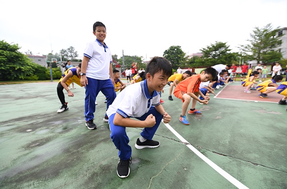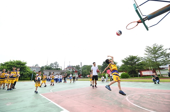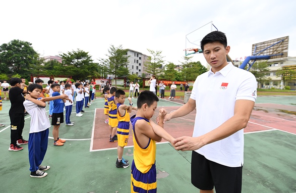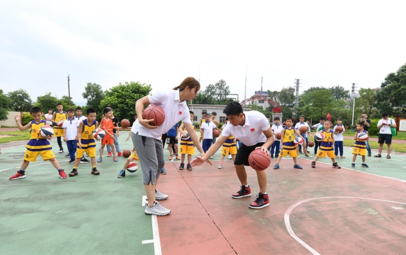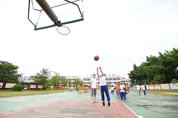 隨后,支教課程進(jìn)入到有球環(huán)節(jié)。從最基礎(chǔ)的原地運(yùn)球,再到較有實(shí)戰(zhàn)意義的左右交臂運(yùn)球、背后運(yùn)球等,黃文威、陳麗宇親身示范,狠抓細(xì)節(jié),手把手教學(xué)。臺(tái)風(fēng)將至,天氣悶熱,籃球場(chǎng)上,冠軍教練和孩子揮汗如雨,黃文威不斷地重復(fù)示范三步上籃的技術(shù)要點(diǎn),陳麗宇在投籃比拼環(huán)節(jié)激情吶喊,籃球支教以南粵古驛道定向大賽為載體走進(jìn)阮嘯仙紅軍小學(xué),其意義不僅僅是專(zhuān)業(yè)知識(shí)的傳授,更是把籃球夢(mèng)帶進(jìn)了這片紅色土壤。