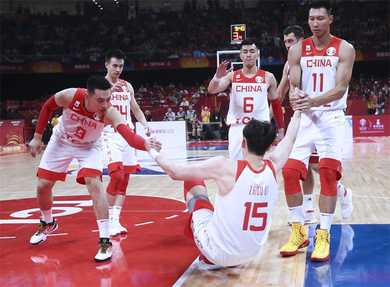 9月2日,中國隊球員翟曉川(左一)、易建聯(lián)(右一)拉起摔倒的隊友周琦。新華社記者蘭紅光攝