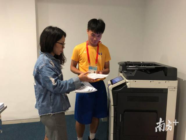 2分鐘時間,13場比賽,每場5份不同的數(shù)據(jù)表,上百人的媒體工作者,這是M數(shù)據(jù)遞送助理每天最緊張的兩分鐘。這個交接的瞬間幾乎每天都在發(fā)生,但宣傳部攝影師嘗試了好多次都沒有抓到這個畫面。志愿者洪海峰說“我們得搶時間,每次上樓一轉(zhuǎn)身就看不到攝影師了”。