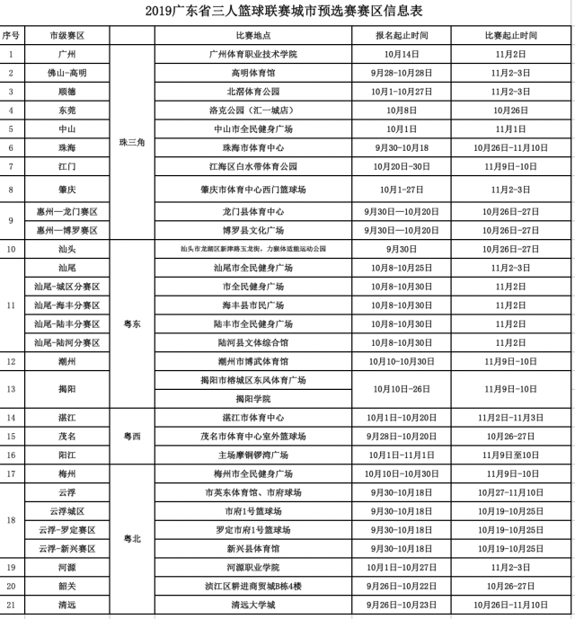 中國體育彩票·2019廣東省3X3籃球聯(lián)賽是一項(xiàng)面向全省草根籃球愛好者的民間草根賽事,具有參與門檻低、包容性強(qiáng)、覆蓋面廣、影響力大的特點(diǎn),受到廣大百姓的喜愛。自9月全面開啟報(bào)名以來,全省各地反響熱烈,報(bào)名火爆。截止至10月23日17時(shí),成功報(bào)名比賽的隊(duì)伍達(dá)到720支,其中男子組528支,女子組192支。在賽制方面,本屆比賽分為城市預(yù)選賽、44強(qiáng)分站賽、32強(qiáng)分站賽和總決賽四個(gè)階段,其中預(yù)選賽階段在全省22個(gè)分賽區(qū)設(shè)立比賽站點(diǎn)。詳見文末附表。