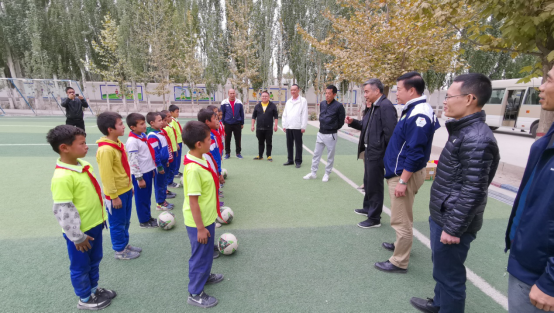 隨后廣東省體育局援疆工作調(diào)研組一行來到疏附縣明德小學(xué),這是一所足球特色學(xué)校,現(xiàn)在在富力足校踢球的伊木然就是明德小學(xué)的學(xué)生,他從富力足校的選拔中脫穎而出,被選到富力足校學(xué)習(xí)踢球。在明德小學(xué)訓(xùn)練場(chǎng)上,調(diào)研組遇到了從廣州市天河區(qū)啟慧學(xué)校到疏附縣明德小學(xué)進(jìn)行足球援疆的許均猛老師,柯國(guó)洪副巡視員詢問許均猛老師的訓(xùn)練和支教情況,并鼓勵(lì)他為廣東足球援疆做出貢獻(xiàn)。