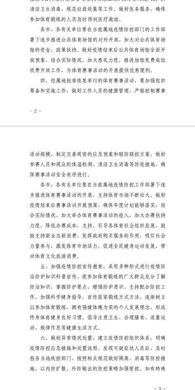 “通知”同時(shí)指出,在場(chǎng)館開放、賽事舉辦的恢復(fù)工作中,要堅(jiān)持疫情防控優(yōu)先,明確防控責(zé)任,經(jīng)屬地批準(zhǔn)恢復(fù)開放的公共體育場(chǎng)館和經(jīng)屬地批準(zhǔn)恢復(fù)舉行的體育賽事活動(dòng),都要加強(qiáng)各項(xiàng)防控工作,做好登記管理、監(jiān)測(cè)體溫、限流等工作。