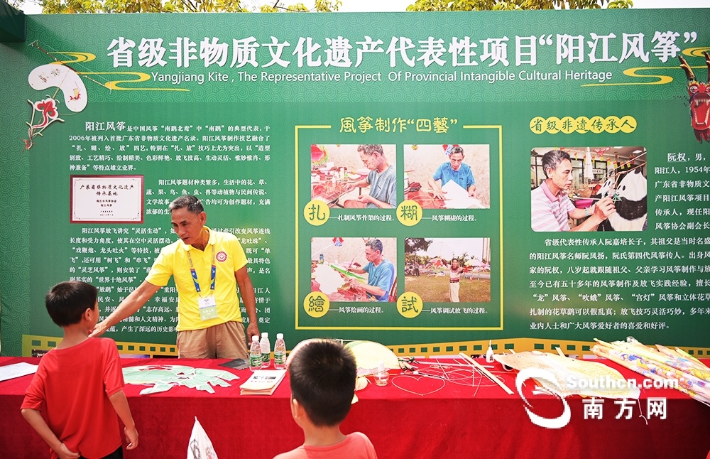 “這是靈芝,待會會有師傅教你怎么做”,在2020年“中國農(nóng)民豐收節(jié)”系列活動暨南粵古驛道定向大賽封開站啟動儀式現(xiàn)場開設(shè)的“省級非物質(zhì)文化遺產(chǎn)代表性項目‘陽江風(fēng)箏’”展位前,阮權(quán)正在給圍觀的家長和小朋友展示制作“靈芝風(fēng)箏”的精湛技藝。作為省非物質(zhì)文化遺產(chǎn)陽江風(fēng)箏項目省級傳承人,他表示能在南粵古驛道舞臺上展示陽江風(fēng)箏,將有助于風(fēng)箏文化的推廣。