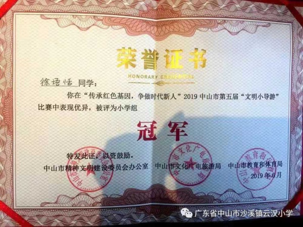 7月13日上午,在中山市博覽中心舉行的“傳承紅色文化,爭做時代新人——中山市第五屆文明小導(dǎo)游”總決賽完美收官。沙溪鎮(zhèn)云漢小學(xué)徐語恬同學(xué)經(jīng)歷了海選,半決賽,總決賽的層層角逐,可謂“過五關(guān)斬六將”,最終獲得了總決賽的冠軍。