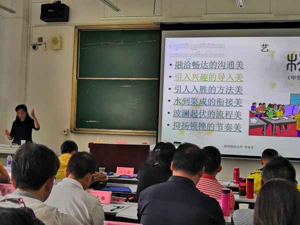 第一場打頭陣的專題培訓(xùn),是由貴州師范大學(xué)李亞軍教授給中山教師學(xué)習(xí)團(tuán)主講的《建構(gòu)有效的教學(xué)過程》。李亞軍老師經(jīng)驗(yàn)豐富,曾經(jīng)獲得“全國優(yōu)秀教育碩士導(dǎo)師”、“全國師德標(biāo)兵”等稱號。她長期擔(dān)任貴州省新入崗教師的培訓(xùn)工作,也曾多次擔(dān)任全國師范生技能大賽的評委,因此對一線教師教學(xué)情況的了解比較深入。李亞軍老師一開始從古體字中“教”字入手,讓老師們談一談這個“教”到底代表了什么,老師們都分享了自己看法。在討論后,表現(xiàn)最好的老師還可以獲得一本李亞軍老師出版的最新的她的論著。這一舉措大大激發(fā)了老師們的熱情,對課程的情感投入也由此變得更加高漲,對“有效教學(xué)”的內(nèi)涵也有了更深刻的認(rèn)識。其中,老師們感悟最深的應(yīng)該是李亞軍老師跟我們探討了一個我們?nèi)粘=虒W(xué)中覺得最難解決的問題:學(xué)生上課睡覺如何解決?結(jié)合大家日常的一線實(shí)際教學(xué)工作,同事們都感到獲益良多。