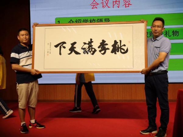 會議首先舉行的是贈送儀式。2019屆高三家委會代表覃先生向李自可校長贈予題為“碩果累累”、“桃李滿天下”的牌匾,表示家委會對學(xué)校的感謝與美好祝愿。而“精準(zhǔn)教學(xué)育桃李,八成學(xué)習(xí)上本科”“零基礎(chǔ)訓(xùn)出211,德藝雙馨數(shù)陳燁”的牌匾,體現(xiàn)了家委會對學(xué)校藝術(shù)教育的肯定和藝術(shù)班老師的感恩。贈送儀式之后,家委會代表覃先生與藝術(shù)教師代表陳燁、校優(yōu)秀畢業(yè)生覃航艦合影留念,整個過程溫馨、勵志。